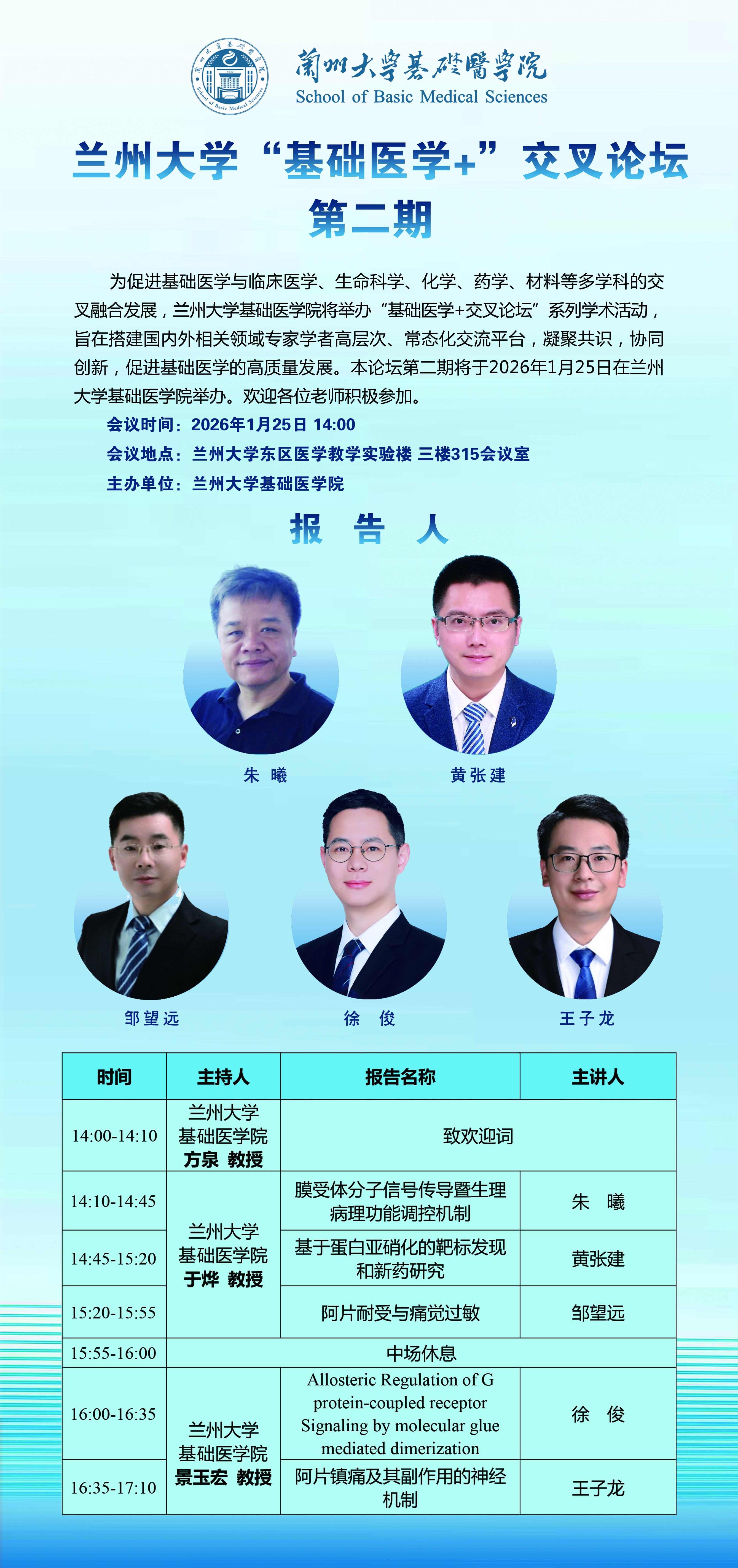 为促进基础医学与临床医学、生命科学、化学、药学、材料等多学科的交叉融合发展,兰州大学基础医学院将举办“基础医学+交叉论坛”系列学术活动,旨在搭建国内外相关领域专家学者高层次、常态化交流平台,凝聚共识,协同创新,促进基础医学的高质量发展。本论坛第二期将于2026年1月25日在兰州大学基础医学院举办。欢迎各位老师积极参加。