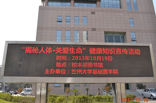 “揭秘人体·关爱生命” 健康知识宣传系列活动已举办三次,旨在让更多的师生了解医学知识,通过对人体结构及健康常识的了解,引导广大师生认识生命、珍爱生命。2013年,经学院组织申报,由学校确立为“兰州大学校园文化精品建设项目”。此项宣传月活动从10月19日起,预计持续开展到11月中旬,内容包括医疗知识宣讲、医疗知识竞赛、医疗健康影片放映等。