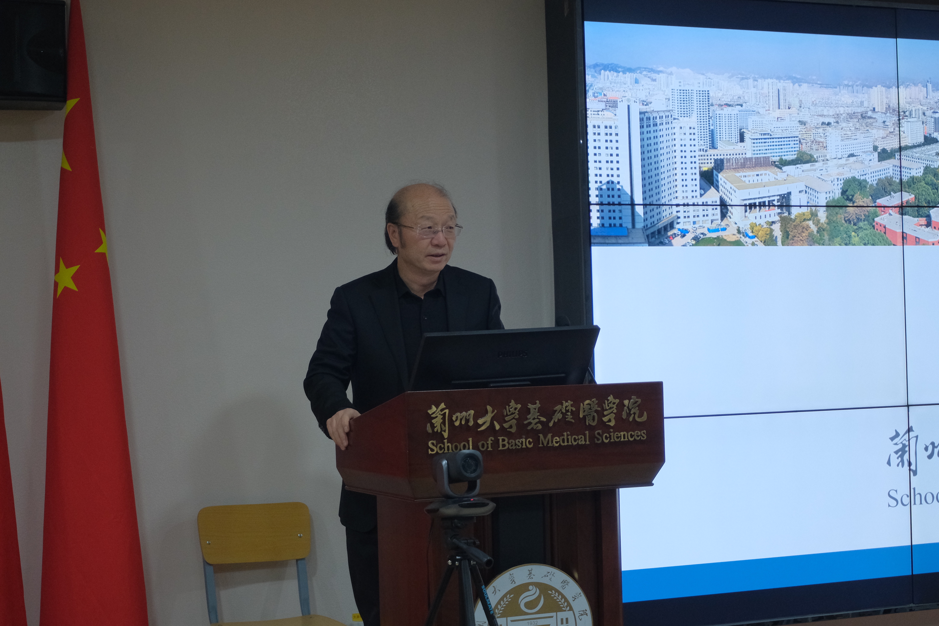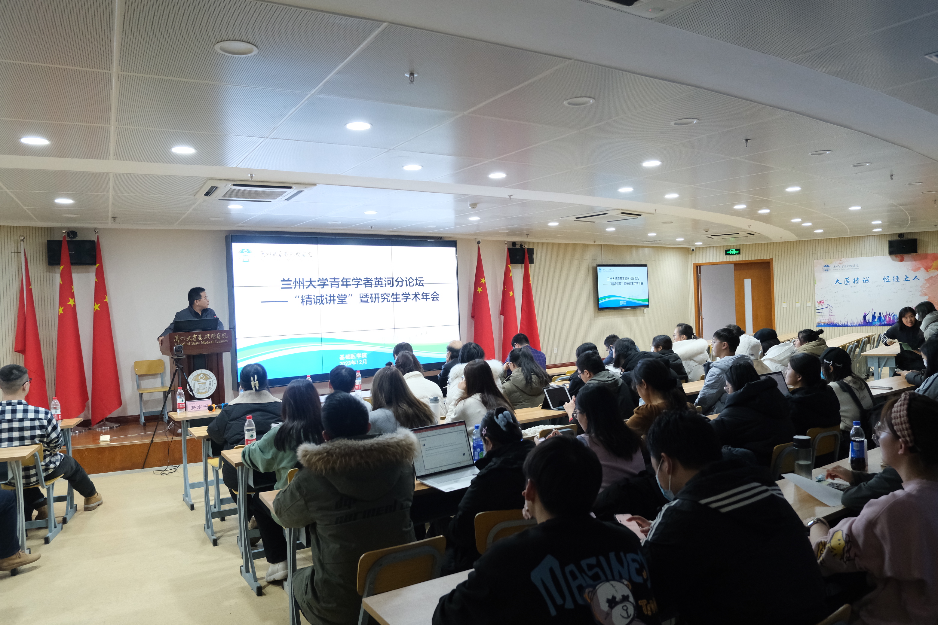 “主动融入新发展格局,加快推进全方位开放。”,为推进更加开放积极的人才政策,畅通国内国际教育循环,促进校内师生与国际学者之间的学术交流。2023年12月15日15:00,兰州大学青年学者黄河分论坛——“精诚讲堂”暨研究生学术年会系列报告第36-39期在兰州大学基础医学院医学教学实验楼一楼报告厅成功举办,会议由党委书记安东平主持。参会人员包括兰州大学基础医学院院长宋焱峰,副院长方泉,党委副书记、副院长谭玲玲,以及基础医学院全体研究生、本科生。