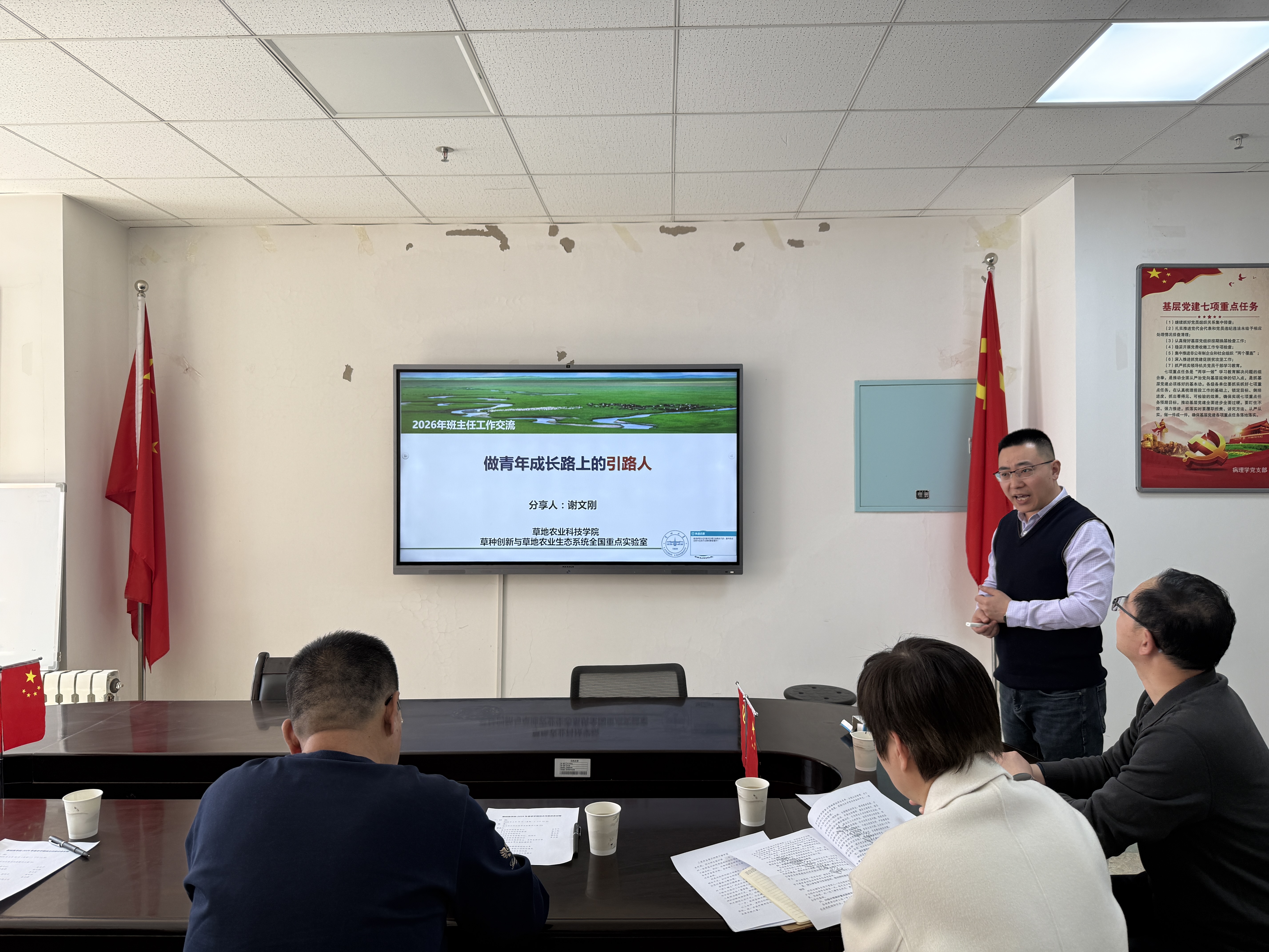 3月16日,基础医学院2026年春季学期学生思政工作专题会暨班主任座谈会在实验大楼701召开。学院党委书记安东平,班子成员景玉宏、谭玲玲、李贞源,全体本科生、研究生班主任,专兼职辅导员参加座谈会,会议邀请草地农业科技学院谢文刚教授做经验分享。